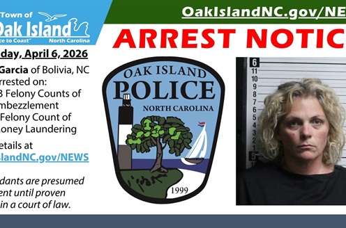 The Oak Island Police Department has arrested Amy Garcia (also known as Amy Woodruff and Amy Sizemore) of Bolivia, NC on thirteen (13) Felony Counts of Embezzlement and one (1) Felony Count of Money Laundering..